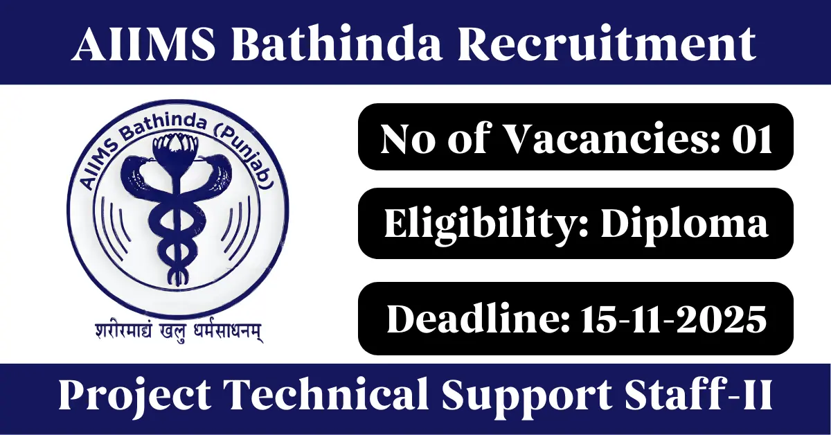 AIIMS Bathinda Recruitment 2025: Apply for 1 Project Technical Support Staff-II vacancies. All India Institute of Medical Sciences Bathinda invited applications from eligible and interested candidates to fill up Project Technical Support Staff-II Posts through AIIMS Bathinda official notification November 2025. Job seekers who are looking for a career in Bathinda – Punjab Government can make use of this opportunity. Interested candidates can attend for Walk-in-interview on 15-Nov-2025