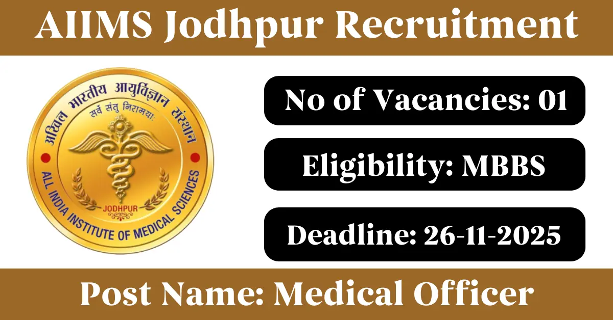 AIIMS Jodhpur Recruitment 2025: Apply for 1 Medical Officer vacancies. All India Institute Of Medical Sciences Jodhpur invited applications from eligible and interested candidates to fill up Medical Officer Posts through AIIMS Jodhpur official notification November 2025. Job seekers who are looking for a career in Sirohi – Rajasthan Government can make use of this opportunity. Interested candidates can attend for Walk-in-interview on 26-Nov-2025