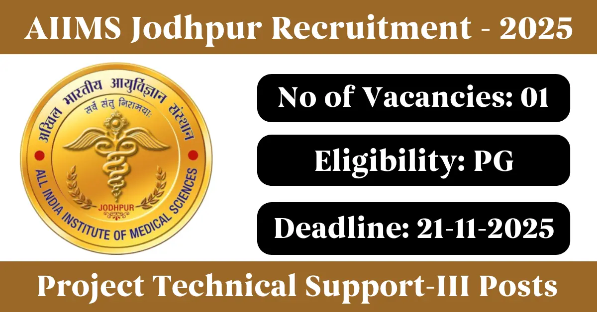 AIIMS Jodhpur Recruitment 2025: Apply for 1 Project Technical Support-III vacancies. All India Institute Of Medical Sciences Jodhpur invited applications from eligible and interested candidates to fill up Project Technical Support-III Posts through AIIMS Jodhpur official notification November 2025. Job seekers who are looking for a career in Jodhpur – Rajasthan Government can make use of this opportunity. Interested candidates can attend for Walk-in-interview on 21-Nov-2025