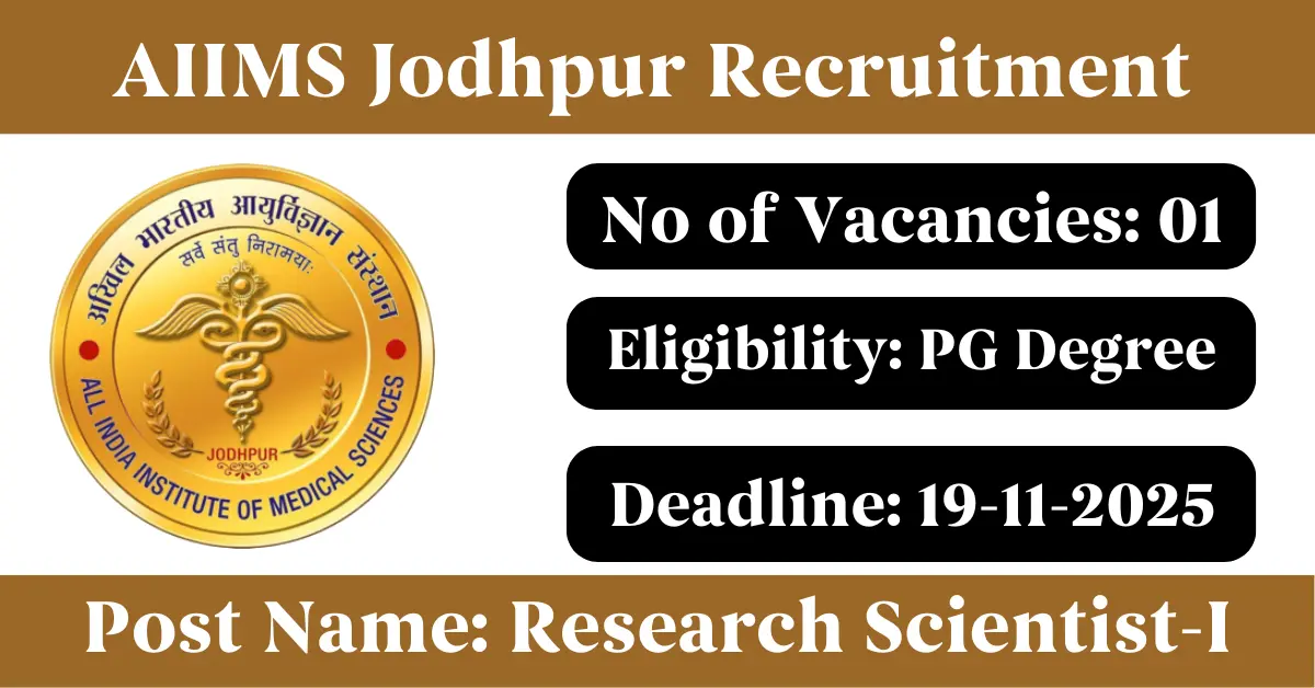 AIIMS Jodhpur Recruitment 2025: Apply for 1 Research Scientist-I vacancies. All India Institute Of Medical Sciences Jodhpur invited applications from eligible and interested candidates to fill up Research Scientist-I Posts through AIIMS Jodhpur official notification November 2025. Job seekers who are looking for a career in Jodhpur – Rajasthan Government can make use of this opportunity. Interested candidates can attend for Walk-in-interview on 19-Nov-2025