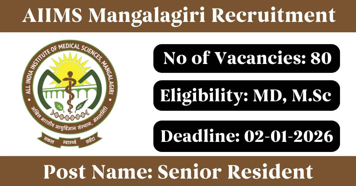 AIIMS Mangalagiri Recruitment 2025: Apply for 80 Senior Resident & Demonstrator vacancies. All India Institute of Medical Sciences Mangalagiri invited applications from eligible and interested candidates to fill up Senior Resident & Demonstrator Posts through AIIMS Mangalagiri official notification December 2025. Job seekers who are looking for a career in Guntur – Andhra Pradesh Government can make use of this opportunity. Interested candidates can Apply Online on or before 02-Jan-2026
