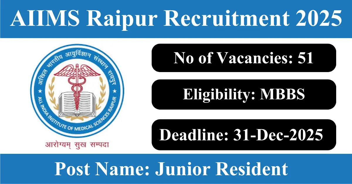 AIIMS Raipur Recruitment 2026: Apply for 51 Junior Resident vacancies. All India Institute of Medical Sciences Raipur invited applications from eligible and interested candidates to fill up Junior Resident Posts through AIIMS Raipur official notification December 2025. Job seekers who are looking for a career in Raipur – Chhattisgarh Government can make use of this opportunity. Interested candidates can Apply Online on or before 31-Dec-2025