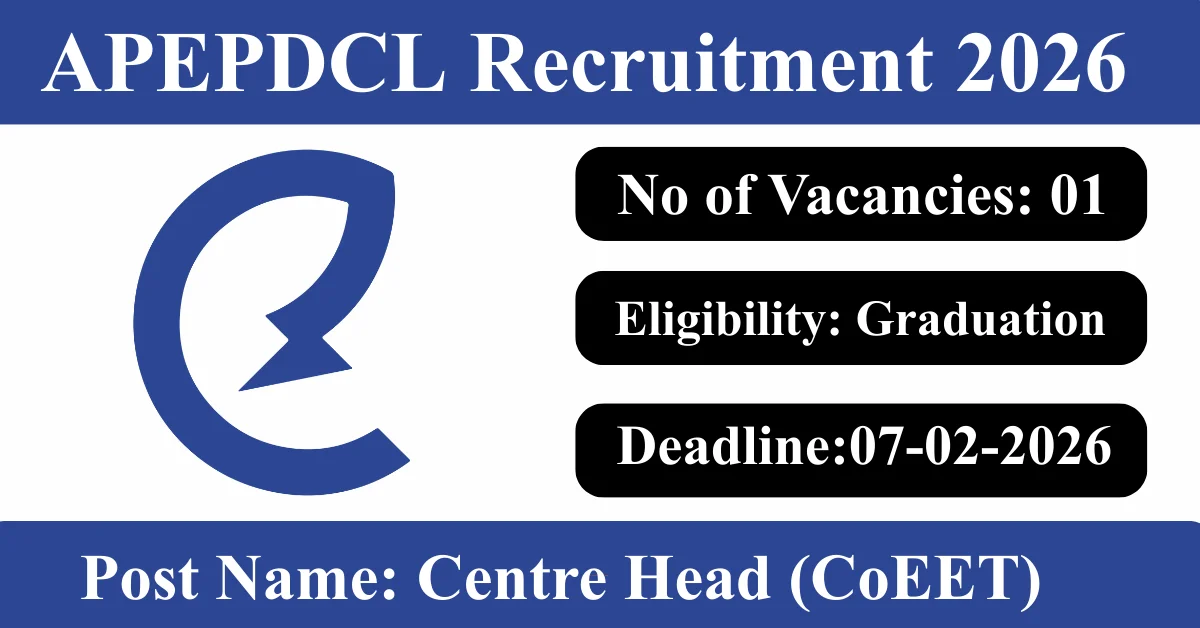 APEPDCL Recruitment 2026: Apply for 1 Centre Head (CoEET) vacancies. Andhra Pradesh Eastern Power Distribution Company Limited invited applications from eligible and interested candidates to fill up Centre Head (CoEET) Posts through APEPDCL official notification January 2026. Job seekers who are looking for a career in Visakhapatnam – Andhra Pradesh Government can make use of this opportunity. Interested candidates can Apply Online on or before 07-Feb-2026
