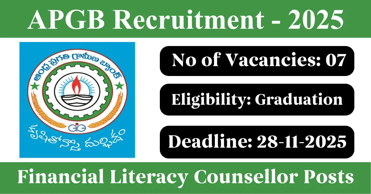 APGB Recruitment 2025: Apply for 7 Financial Literacy Counsellor vacancies. Andhra Pradesh Grameena Bank invited applications from eligible and interested candidates to fill up Financial Literacy Counsellor Posts through APGB official notification November 2025. Job seekers who are looking for a career in East Godavari, Vizianagaram, Eluru, Visakhapatnam, Srikakulam, Kadapa, Prakasam – Andhra Pradesh Government can make use of this opportunity. Interested candidates can Apply Offline on or before 28-Nov-2025