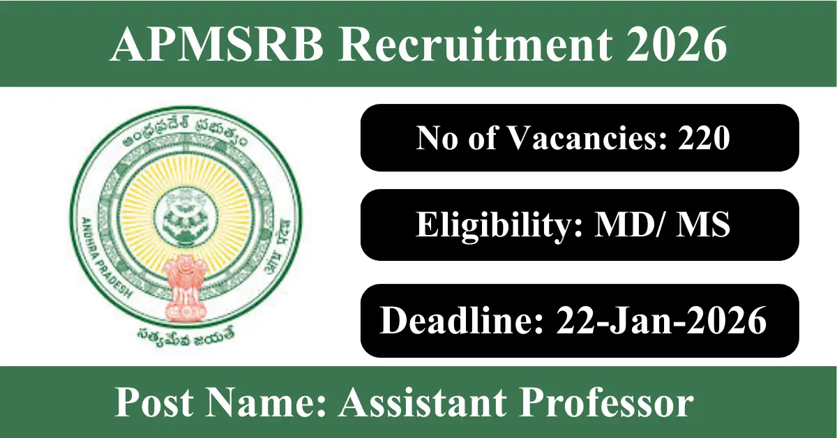 APMSRB Recruitment 2026: Apply for 220 Assistant Professor vacancies. Andhra Pradesh Medical Services Recruitment Board invited applications from eligible and interested candidates to fill up Assistant Professor Posts through APMSRB official notification January 2026. Job seekers who are looking for a career in Andhra Pradesh Government can make use of this opportunity. Interested candidates can Apply Online on or before 22-Jan-2026