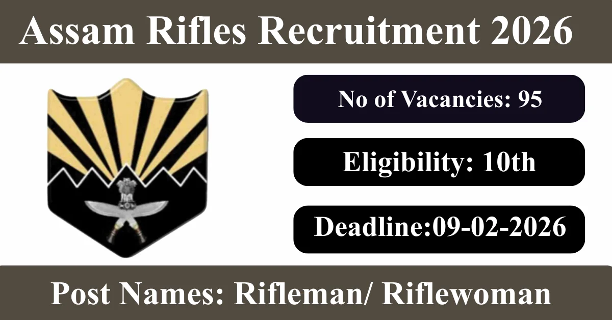 Assam Rifles Recruitment 2026: Apply for 95 Rifleman/ Riflewoman vacancies. Assam Rifles invited applications from eligible and interested candidates to fill up Rifleman/ Riflewoman Posts through Assam Rifles official notification January 2026. Job seekers who are looking for a career in Assam Government can make use of this opportunity. Interested candidates can Apply Online on or before 09-Feb-2026