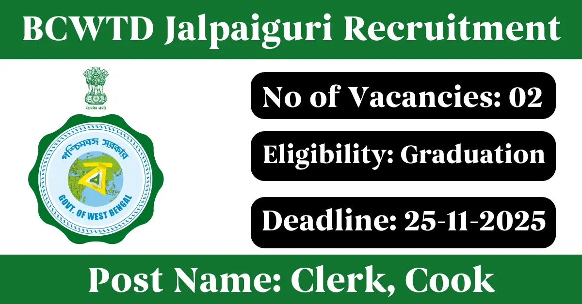 BCWTD Jalpaiguri Recruitment 2025: Apply for 2 Clerk, Cook vacancies. Backward Classes Welfare & Tribal Development Jalpaiguri invited applications from eligible and interested candidates to fill up Clerk, Cook Posts through BCWTD Jalpaiguri official notification November 2025. Job seekers who are looking for a career in Jalpaiguri – West Bengal Government can make use of this opportunity. Interested candidates can Apply Offline on or before 25-Nov-2025