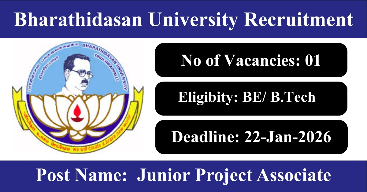 BDU Recruitment 2026: Apply for 1 Junior Project Associate vacancies. Bharathidasan University invited applications from eligible and interested candidates to fill up Junior Project Associate Posts through BDU official notification January 2026. Job seekers who are looking for a career in Tiruchirappalli – Tamil Nadu Government can make use of this opportunity. Interested candidates can Apply Offline on or before 22-Jan-2026