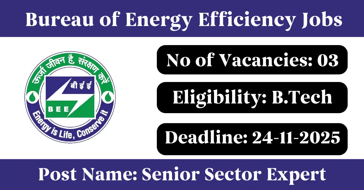 BEE Recruitment 2025: Apply for 3 Senior Sector Expert vacancies. Bureau of Energy Efficiency invited applications from eligible and interested candidates to fill up Senior Sector Expert Posts through BEE official notification November 2025. Job seekers who are looking for a career in Delhi – New Delhi Government can make use of this opportunity. Interested candidates can Apply Offline on or before 24-Nov-2025