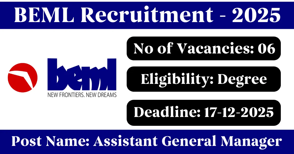 BEML Recruitment 2025: Apply for 6 General Manager vacancies. Bharat Earth Movers Limited invited applications from eligible and interested candidates to fill up General Manager Posts through BEML official notification December 2025. Job seekers who are looking for a career in Palakkad – Kerala, Delhi – New Delhi, Mysore, Bengaluru – Karnataka, Pune – Maharashtra Government can make use of this opportunity. Interested candidates can Apply Online on or before 17-Dec-2025