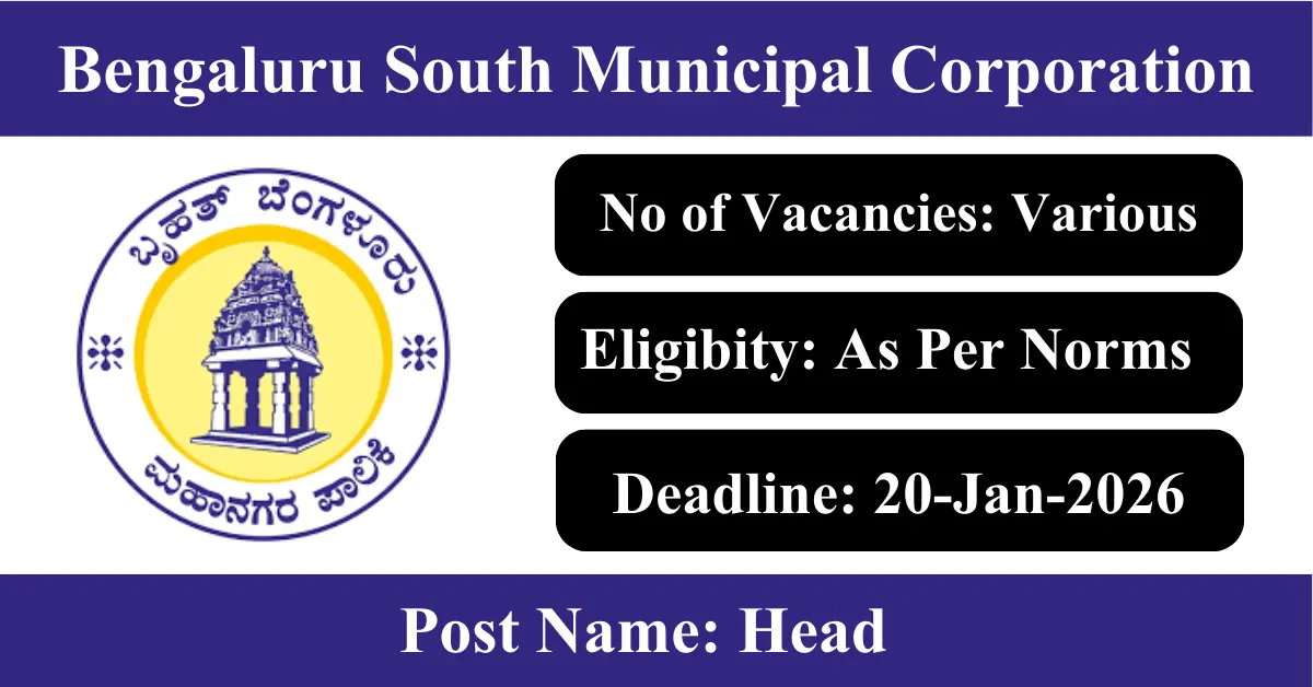 Bengaluru South Municipal Corporation Recruitment 2026: Apply for Various Head vacancies. Bengaluru South Municipal Corporation invited applications from eligible and interested candidates to fill up Head Posts through Bengaluru South Municipal Corporation official notification January 2026. Job seekers who are looking for a career in Bengaluru – Karnataka Government can make use of this opportunity. Interested candidates can Apply Offline on or before 20-Jan-2026