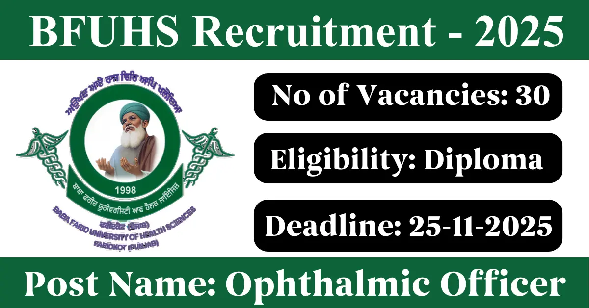 BFUHS Recruitment 2025: Apply for 30 Ophthalmic Officer vacancies. Baba Farid University of Health Science invited applications from eligible and interested candidates to fill up Ophthalmic Officer Posts through BFUHS official notification November 2025. Job seekers who are looking for a career in Faridkot – Punjab Government can make use of this opportunity. Interested candidates can Apply Online on or before 25-Nov-2025
