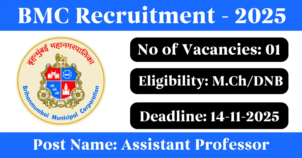 BMC Recruitment 2025: Apply for 1 Assistant Professor vacancies. Brihan Mumbai Municipal Corporation invited applications from eligible and interested candidates to fill up Assistant Professor Posts through BMC official notification November 2025. Job seekers who are looking for a career in Mumbai – Maharashtra Government can make use of this opportunity. Interested candidates can Apply Offline on or before 14-Nov-2025