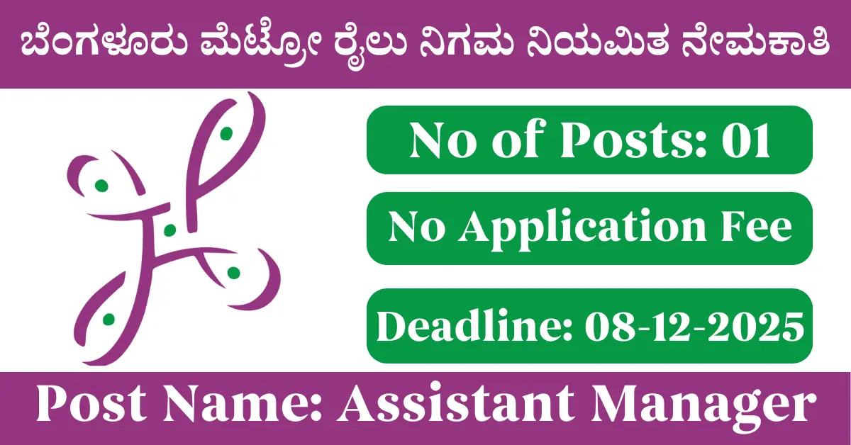 BMRCL Recruitment 2025: Apply for 1 Assistant Manager vacancies. Bangalore Metro Rail Corporation Limited invited applications from eligible and interested candidates to fill up Assistant Manager Posts through BMRCL official notification November 2025. Job seekers who are looking for a career in Bengaluru – Karnataka Government can make use of this opportunity. Interested candidates can Apply Online/Offline on or before 08-Dec-2025
