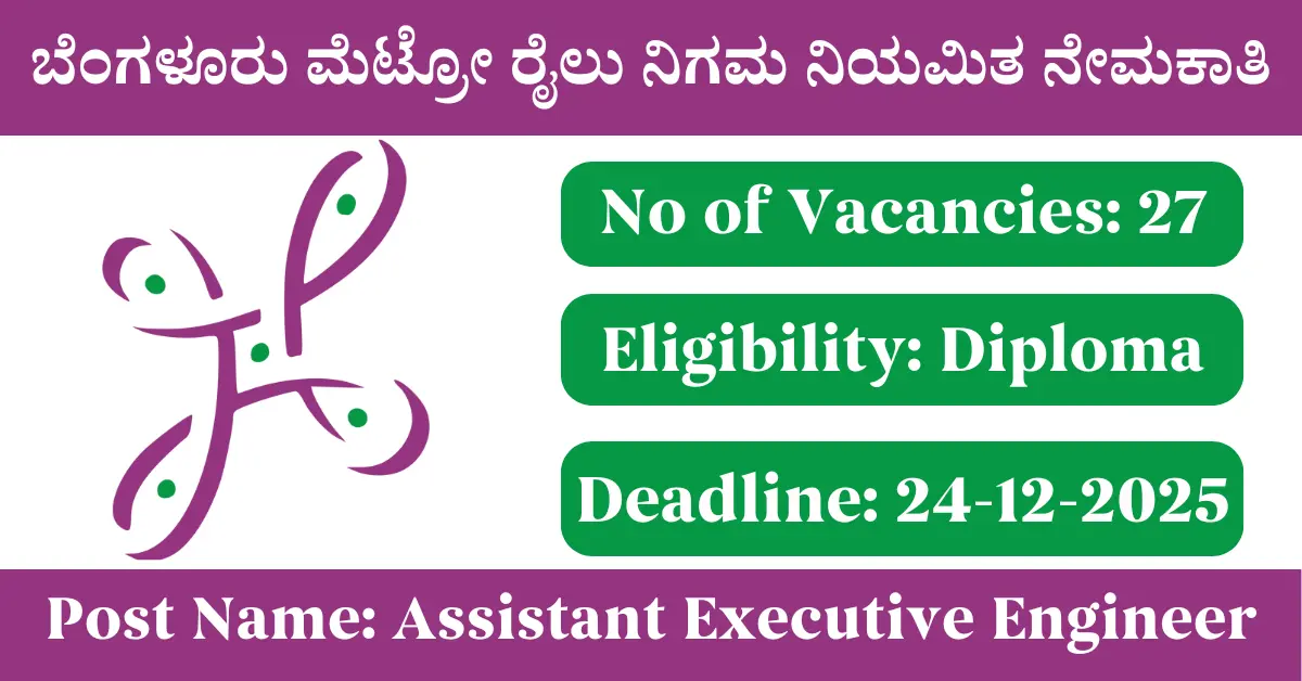 BMRCL Recruitment 2025: Apply for 27 Assistant Engineer vacancies. Bangalore Metro Rail Corporation Limited invited applications from eligible and interested candidates to fill up Assistant Engineer Posts through BMRCL official notification December 2025. Job seekers who are looking for a career in Bengaluru – Karnataka Government can make use of this opportunity. Interested candidates can Apply Online/Offline on or before 24-Dec-2025