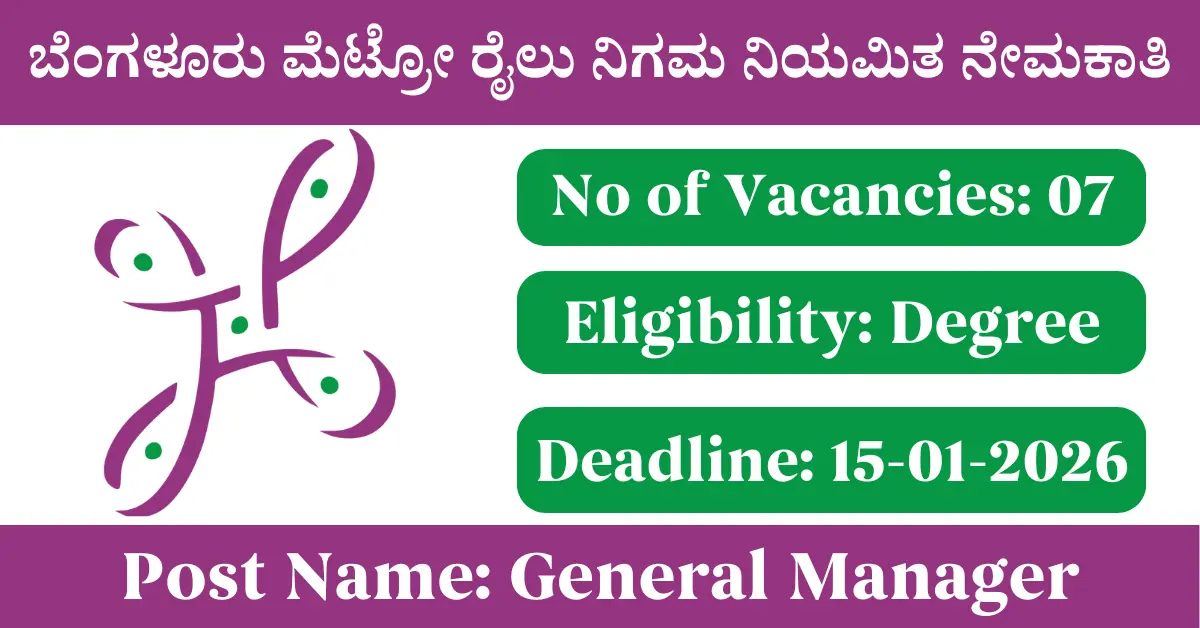 BMRCL Recruitment 2025: Apply for 7 General Manager vacancies. Bangalore Metro Rail Corporation Limited invited applications from eligible and interested candidates to fill up General Manager Posts through BMRCL official notification December 2025. Job seekers who are looking for a career in Bengaluru – Karnataka Government can make use of this opportunity. Interested candidates can Apply Online/Offline on or before 15-Jan-2026