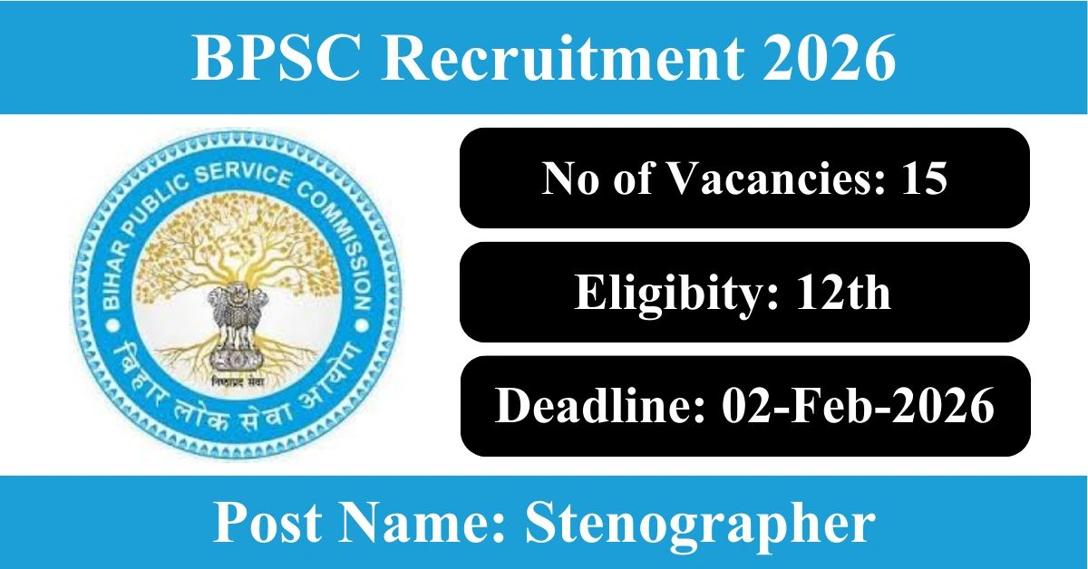 BPSC Recruitment 2026: Apply for 15 Stenographer vacancies. Bihar Public Service Commission invited applications from eligible and interested candidates to fill up Stenographer Posts through BPSC official notification January 2026. Job seekers who are looking for a career in Patna – Bihar Government can make use of this opportunity. Interested candidates can Apply Online on or before 02-Feb-2026