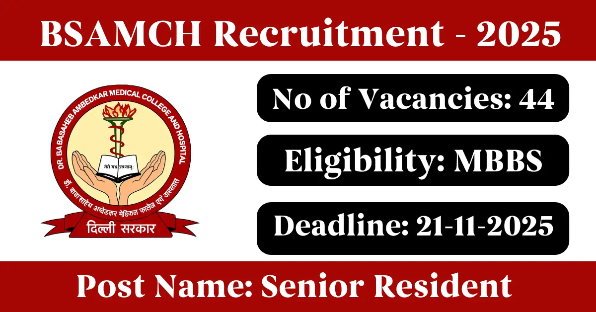 BSAMCH Recruitment 2025: Apply for 44 Senior Resident vacancies. Dr Baba Saheb Ambedkar Hospital and Medical College invited applications from eligible and interested candidates to fill up Senior Resident Posts through BSAMCH official notification November 2025. Job seekers who are looking for a career in Delhi – New Delhi Government can make use of this opportunity. Interested candidates can Apply Online on or before 21-Nov-2025