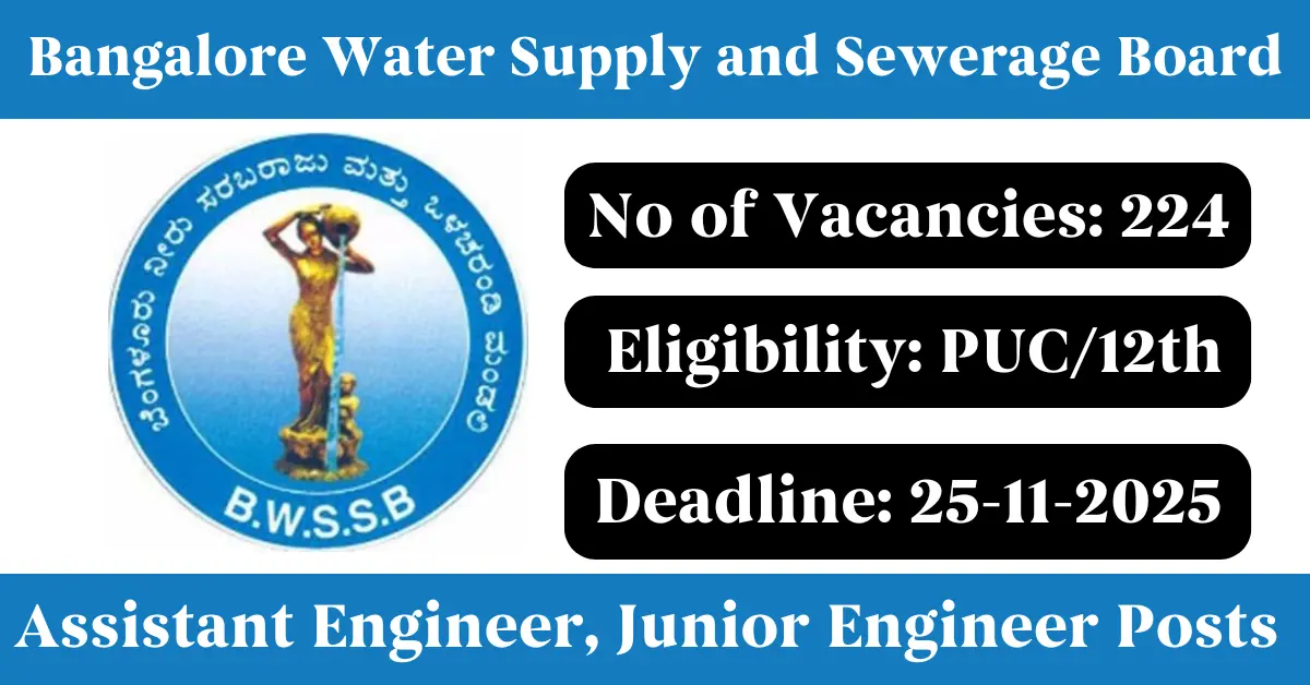 BWSSB Recruitment 2025: Apply for 224 Assistant Engineer, Junior Engineer vacancies. Bangalore Water Supply and Sewerage Board invited applications from eligible and interested candidates to fill up Assistant Engineer, Junior Engineer Posts through official notification November 2025. Job seekers who are looking for a career in Karnataka Government, Bangalore Water Supply and Sewerage Board (BWSSB) can make use of this opportunity. Interested candidates can Apply Online on or before 25-Nov-2025