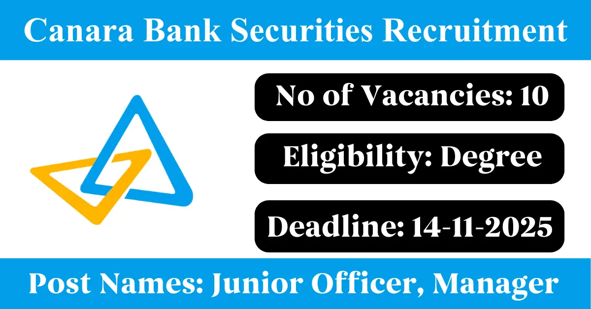 Canara Bank Securities Recruitment 2025: Apply for 10 Junior Officer vacancies. Canara Bank Securities Limited invited applications from eligible and interested candidates to fill up Junior Officer Posts through Canara Bank Securities official notification November 2025. Job seekers who are looking for a career in Mumbai – Maharashtra Government can make use of this opportunity. Interested candidates can send an E-Mail on or before 14-Nov-2025
