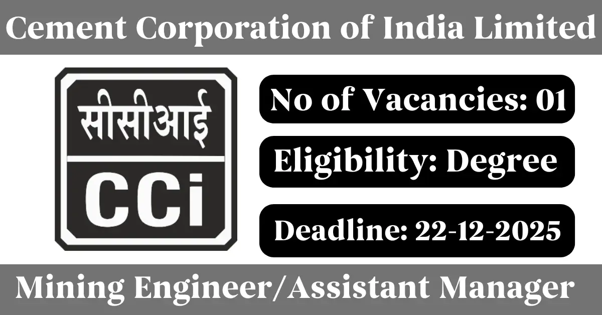 CCI Recruitment 2025: Apply for 1 Mining Engineer/Assistant Manager vacancies. Cement Corporation of India Limited invited applications from eligible and interested candidates to fill up Mining Engineer/Assistant Manager Posts through CCI official notification December 2025. Job seekers who are looking for a career in Sirmaur – Himachal Pradesh Government can make use of this opportunity. Interested candidates can attend for Walk-in-interview on 22-Dec-2025