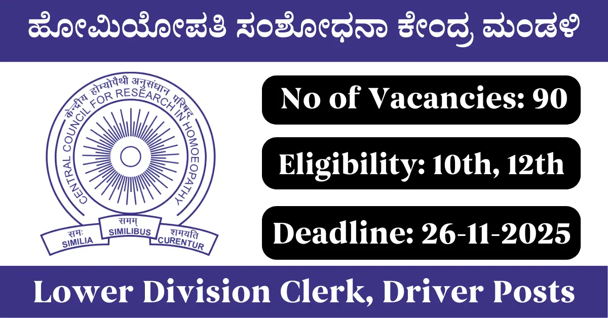 CCRH Recruitment 2025: Apply for 90 Lower Division Clerk, Driver vacancies. Central Council for Research in Homoeopathy invited applications from eligible and interested candidates to fill up Lower Division Clerk, Driver Posts through CCRH official notification November 2025. Job seekers who are looking for a career in All India Government can make use of this opportunity. Interested candidates can Apply Online on or before 26-Nov-2025