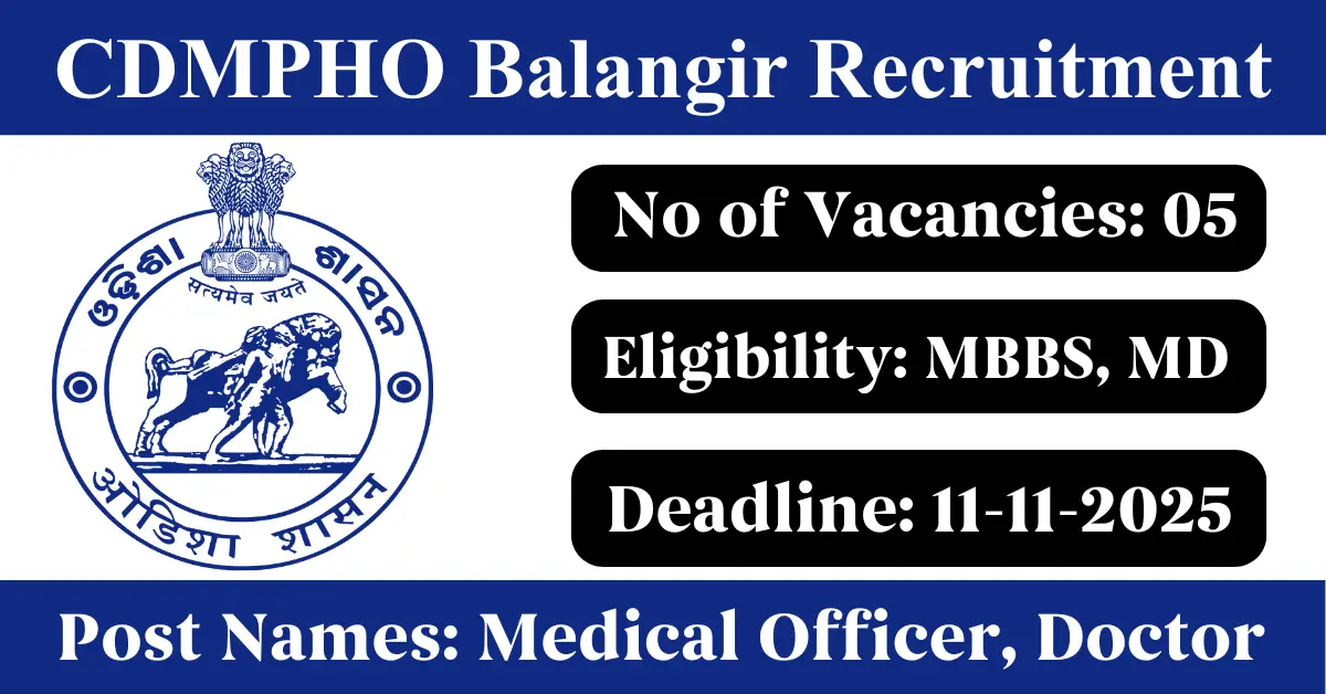 CDMPHO Balangir Recruitment 2025: Apply for 5 Medical Officer vacancies. Chief District Medical & Public Health Office Balangir invited applications from eligible and interested candidates to fill up Medical Officer Posts through CDMPHO Balangir official notification November 2025. Job seekers who are looking for a career in Balangir – Odisha Government can make use of this opportunity. Interested candidates can attend for Walk-in-interview on 11-Nov-2025