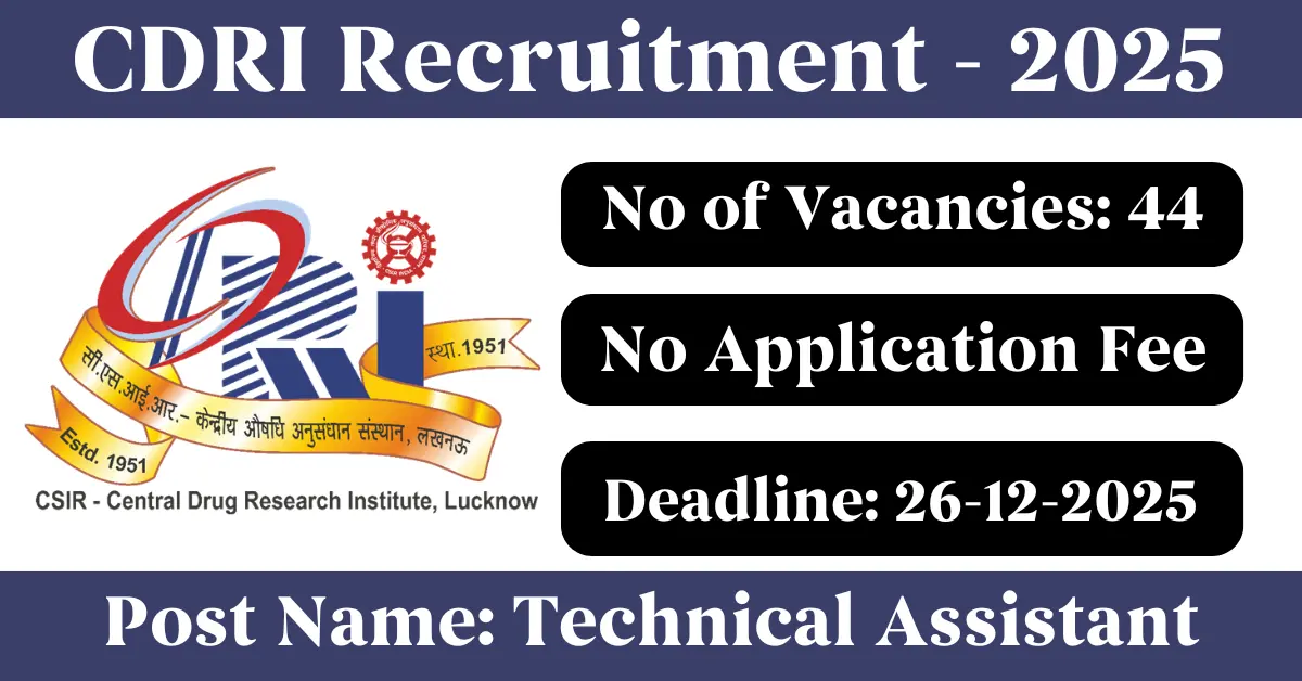CDRI Recruitment 2025: Apply for 44 Technical Assistant vacancies. Central Drug Research Institute invited applications from eligible and interested candidates to fill up Technical Assistant Posts through CDRI official notification November 2025. Job seekers who are looking for a career in Lucknow – Uttar Pradesh Government can make use of this opportunity. Interested candidates can Apply Online on or before 26-Dec-2025