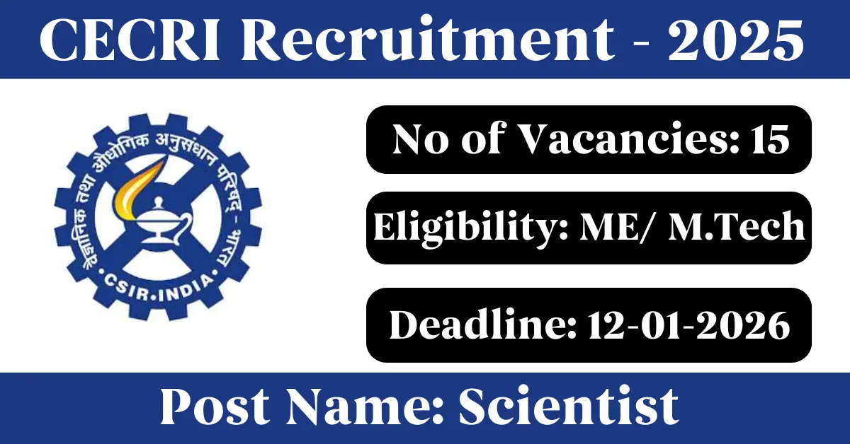 CECRI Recruitment 2025: Apply for 15 Scientist vacancies. Central Electrochemical Research Institute invited applications from eligible and interested candidates to fill up Scientist Posts through CECRI official notification November 2025. Job seekers who are looking for a career in All India Government can make use of this opportunity. Interested candidates can Apply Online on or before 12-Jan-2026