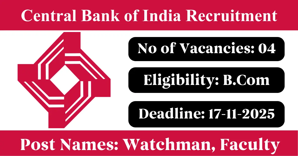 Central Bank of India Recruitment 2025: Apply for 4 Watchman, Faculty vacancies. Central Bank of India invited applications from eligible and interested candidates to fill up Watchman, Faculty Posts through Central Bank of India official notification November 2025. Job seekers who are looking for a career in Darbhanga – Bihar Government can make use of this opportunity. Interested candidates can Apply Offline on or before 17-Nov-2025