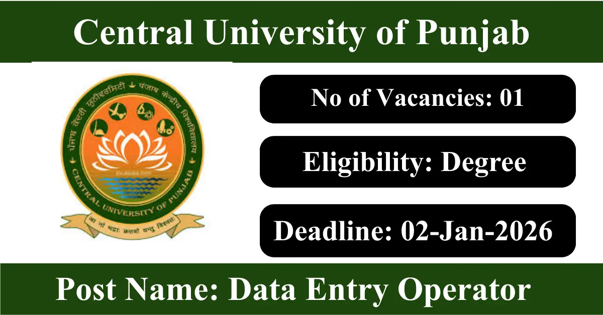 Central University of Punjab Recruitment 2026: Apply for 1 Data Entry Operator vacancies. Central University of Punjab invited applications from eligible and interested candidates to fill up Data Entry Operator Posts through Central University of Punjab official notification December 2025. Job seekers who are looking for a career in Bathinda – Punjab Government can make use of this opportunity. Interested candidates can send an E-Mail on or before 02-Jan-2026