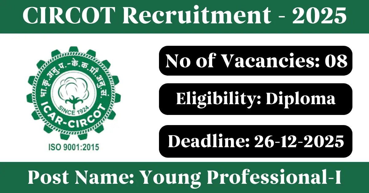 CIRCOT Recruitment 2025: Apply for 8 Young Professional-I vacancies. Central Institute for Research on Cotton Technology invited applications from eligible and interested candidates to fill up Young Professional-I Posts through CIRCOT official notification December 2025. Job seekers who are looking for a career in Mumbai – Maharashtra Government can make use of this opportunity. Interested candidates can send an E-Mail on or before 26-Dec-2025