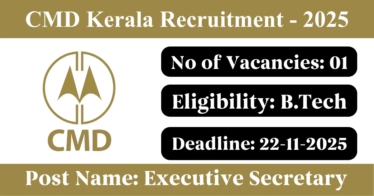CMD Kerala Recruitment 2025: Apply for 1 Executive Secretary & Project Manager vacancies. Centre for Management Development Kerala invited applications from eligible and interested candidates to fill up Executive Secretary & Project Manager Posts through CMD Kerala official notification November 2025. Job seekers who are looking for a career in Kollam – Kerala Government can make use of this opportunity. Interested candidates can Apply Online on or before 22-Nov-2025