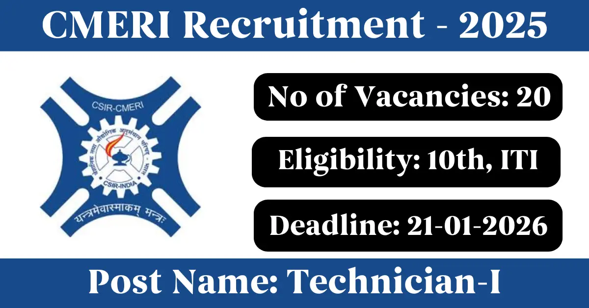 CMERI Recruitment 2025: Apply for 20 Technician-I vacancies. Central Mechanical Engineering Research Institute invited applications from eligible and interested candidates to fill up Technician-I Posts through CMERI official notification December 2025. Job seekers who are looking for a career in Durgapur – West Bengal Government can make use of this opportunity. Interested candidates can Apply Online on or before 21-Jan-2026