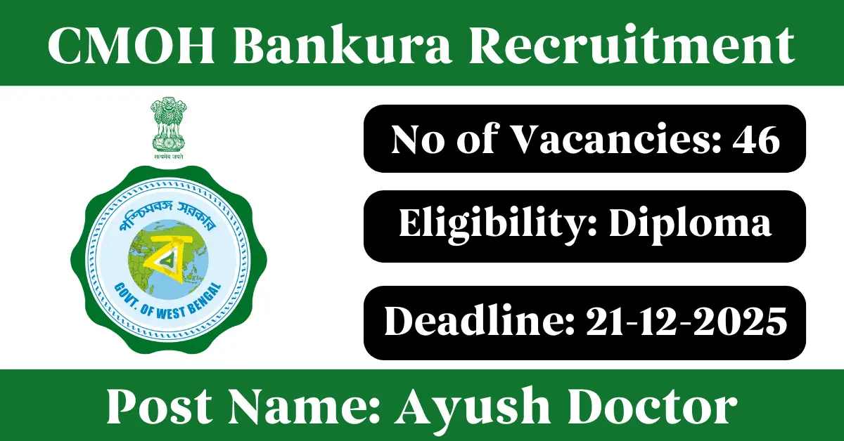 CMOH Bankura Recruitment 2025: Apply for 46 Ayush Doctor, Yoga Instructor vacancies. Chief Medical Office of Health Bankura invited applications from eligible and interested candidates to fill up Ayush Doctor, Yoga Instructor Posts through CMOH Bankura official notification December 2025. Job seekers who are looking for a career in Bankura – West Bengal Government can make use of this opportunity. Interested candidates can Apply Online on or before 21-Dec-2025
