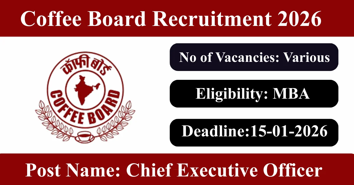 Coffee Board Recruitment 2026: Apply for Various Chief Executive Officer vacancies. Coffee Board of India invited applications from eligible and interested candidates to fill up Chief Executive Officer Posts through Coffee Board official notification January 2026. Job seekers who are looking for a career in Bengaluru – Karnataka Government can make use of this opportunity. Interested candidates can Apply Offline on or before 15-Jan-2026