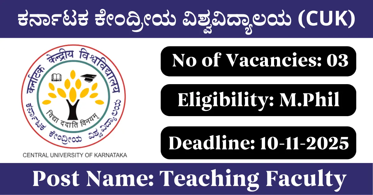 CUK Recruitment 2025: Apply for 3 Teaching Faculty vacancies. Central University of Karnataka invited applications from eligible and interested candidates to fill up Teaching Faculty Posts through CUK official notification November 2025. Job seekers who are looking for a career in Kalaburagi – Karnataka Government can make use of this opportunity. Interested candidates can attend for Walk-in-interview on 10-Nov-2025