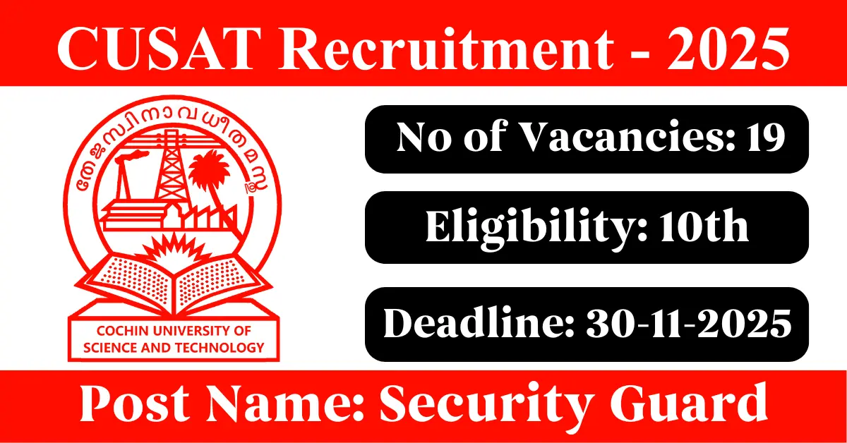 CUSAT Recruitment 2025: Apply for 19 Security Guard vacancies. Cochin University of Science and Technology invited applications from eligible and interested candidates to fill up Security Guard Posts through CUSAT official notification November 2025. Job seekers who are looking for a career in Kochi – Kerala Government can make use of this opportunity. Interested candidates can Apply Online/Offline on or before 30-Nov-2025