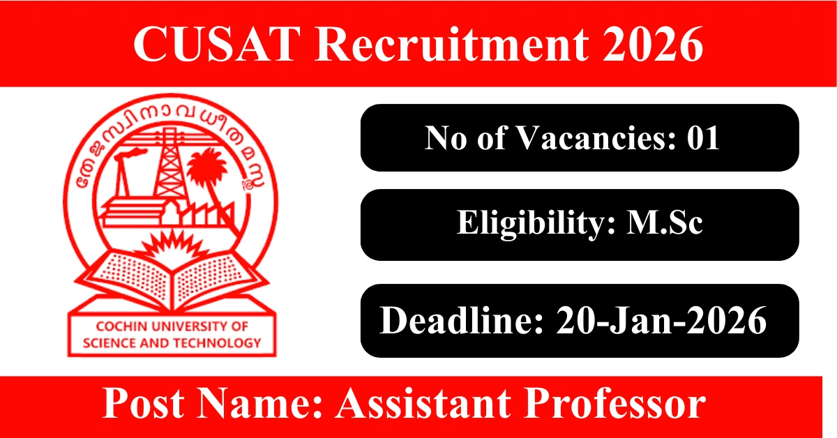 CUSAT Recruitment 2026: Apply for 1 Assistant Professor vacancies. Cochin University of Science and Technology invited applications from eligible and interested candidates to fill up Assistant Professor Posts through CUSAT official notification January 2026. Job seekers who are looking for a career in Kochi – Kerala Government can make use of this opportunity. Interested candidates can Apply Online/Offline on or before 20-Jan-2026