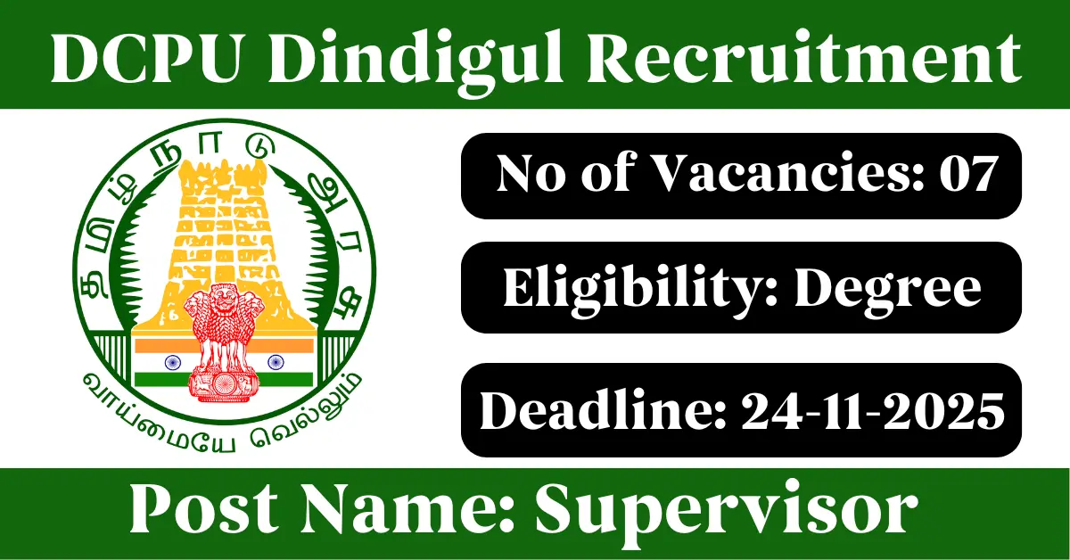 DCPU Dindigul Recruitment 2025: Apply for 7 Supervisor vacancies. District Child Protection Unit Dindigul invited applications from eligible and interested candidates to fill up Supervisor Posts through DCPU Dindigul official notification November 2025. Job seekers who are looking for a career in Dindigul – Tamil Nadu Government can make use of this opportunity. Interested candidates can Apply Offline on or before 24-Nov-2025