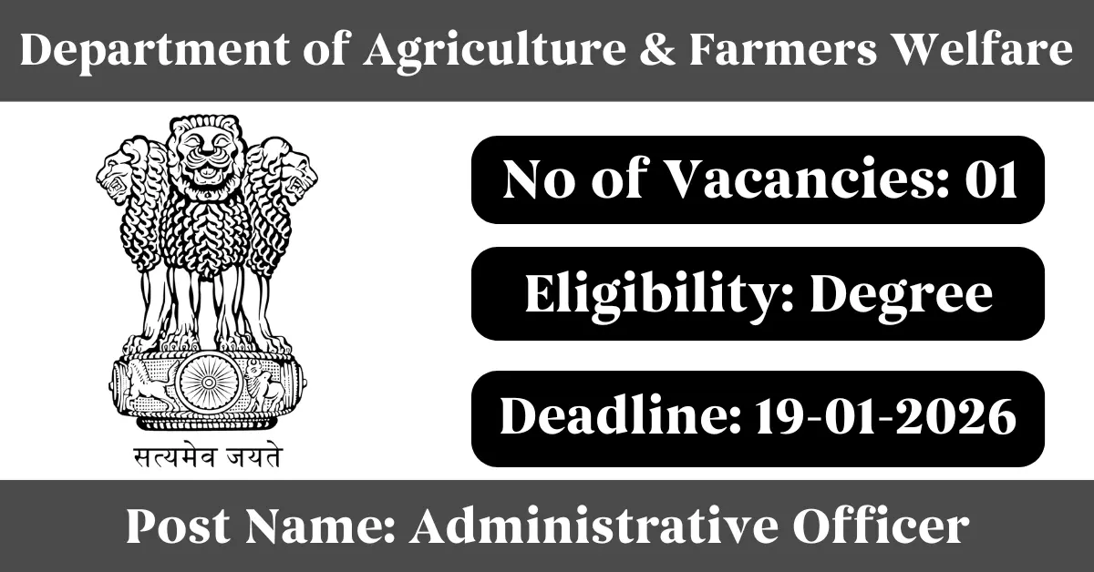 Department of Agriculture & Farmers Welfare Recruitment 2025: Apply for 1 Administrative Officer vacancies. Department of Agriculture & Farmers Welfare invited applications from eligible and interested candidates to fill up Administrative Officer Posts through Department of Agriculture & Farmers Welfare official notification December 2025. Job seekers who are looking for a career in Delhi – New Delhi Government can make use of this opportunity. Interested candidates can Apply Offline on or before 19-Jan-2026