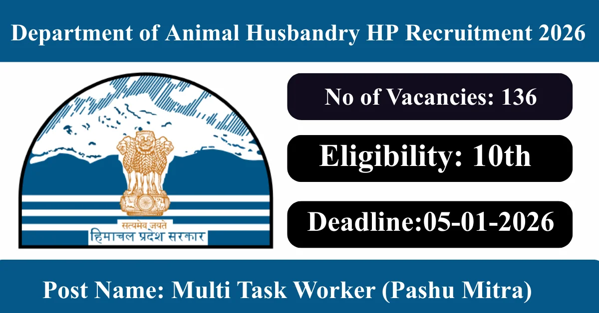 Department of Animal Husbandry HP Recruitment 2026: Apply for 136 Multi Task Worker (Pashu Mitra) vacancies. Department of Animal Husbandry Himachal Pradesh invited applications from eligible and interested candidates to fill up Multi Task Worker (Pashu Mitra) Posts through Department of Animal Husbandry HP official notification January 2026. Job seekers who are looking for a career in Kangra, Kullu – Himachal Pradesh Government can make use of this opportunity. Interested candidates can Apply Offline on or before 05-Feb-2026
