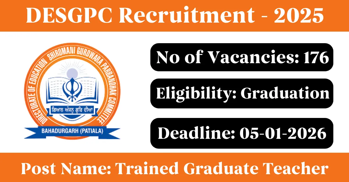 DESGPC Recruitment 2025: Apply for 176 TGT, PGT vacancies. Directorate of Education Shiromani Gurdwara Parbandhak Committee invited applications from eligible and interested candidates to fill up TGT, PGT Posts through DESGPC official notification December 2025. Job seekers who are looking for a career in Punjab Government can make use of this opportunity. Interested candidates can Apply Online on or before 05-Jan-2026