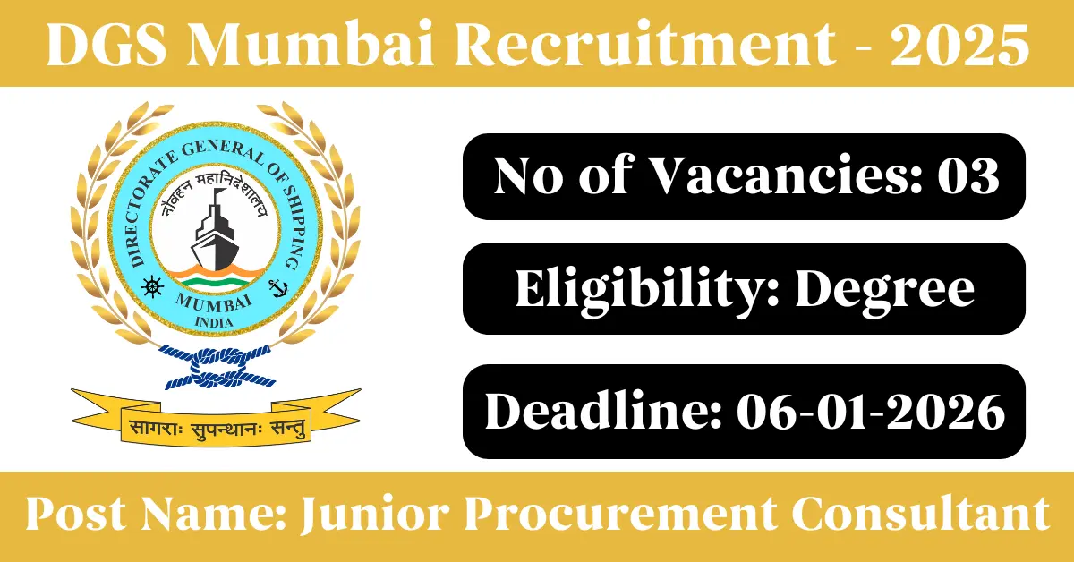 DGS Mumbai Recruitment 2025: Apply for 3 Junior Procurement Consultant vacancies. Directorate General of Shipping Mumbai invited applications from eligible and interested candidates to fill up Junior Procurement Consultant Posts through DGS Mumbai official notification December 2025. Job seekers who are looking for a career in Mumbai – Maharashtra Government can make use of this opportunity. Interested candidates can Apply Offline on or before 06-Jan-2026