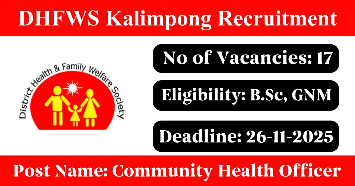 DHFWS Kalimpong Recruitment 2025: Apply for 17 Community Health Officer vacancies. District Health and Family Welfare Society Kalimpong invited applications from eligible and interested candidates to fill up Community Health Officer Posts through DHFWS Kalimpong official notification November 2025. Job seekers who are looking for a career in Kalimpong – West Bengal Government can make use of this opportunity. Interested candidates can send an E-Mail on or before 26-Nov-2025