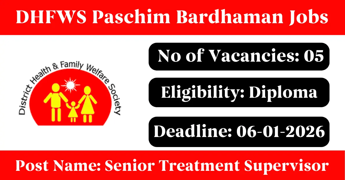 DHFWS Paschim Bardhaman Recruitment 2025: Apply for 5 Senior Treatment Supervisor vacancies. District Health and Family Welfare Samiti Paschim Bardhaman invited applications from eligible and interested candidates to fill up Senior Treatment Supervisor Posts through DHFWS Paschim Bardhaman official notification December 2025. Job seekers who are looking for a career in Paschim Bardhaman – West Bengal Government can make use of this opportunity. Interested candidates can Apply Online on or before 06-Jan-2026