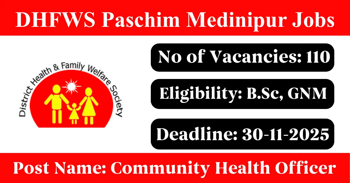 DHFWS Paschim Medinipur Recruitment 2025: Apply for 110 Community Health Officers vacancies. District Health and Family Welfare Society Paschim Medinipur invited applications from eligible and interested candidates to fill up Community Health Officers Posts through DHFWS Paschim Medinipur official notification November 2025. Job seekers who are looking for a career in Paschim Medinipur – West Bengal Government can make use of this opportunity. Interested candidates can Apply Online on or before 30-Nov-2025