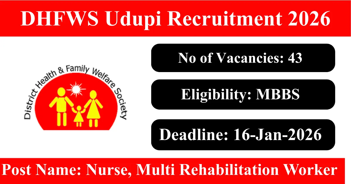 DHFWS Udupi Recruitment 2026: Apply for 43 Nurse, Multi Rehabilitation Worker vacancies. District Health and Family Welfare Society Udupi invited applications from eligible and interested candidates to fill up Nurse, Multi Rehabilitation Worker Posts through DHFWS Udupi official notification January 2026. Job seekers who are looking for a career in Udupi – Karnataka Government can make use of this opportunity. Interested candidates can Apply Offline on or before 16-Jan-2026