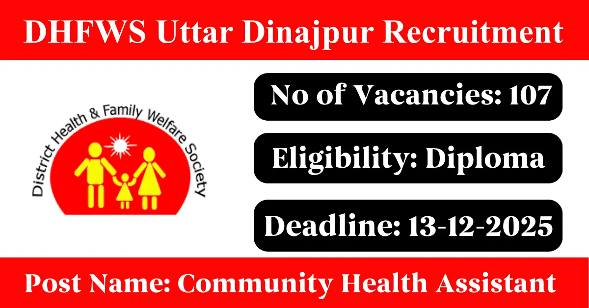 DHFWS Uttar Dinajpur Recruitment 2025: Apply for 107 Community Health Assistant vacancies. District Health and Family Welfare Society Uttar Dinajpur invited applications from eligible and interested candidates to fill up Community Health Assistant Posts through DHFWS Uttar Dinajpur official notification November 2025. Job seekers who are looking for a career in Uttar Dinajpur – West Bengal Government can make use of this opportunity. Interested candidates can Apply Online/Offline on or before 13-Dec-2025