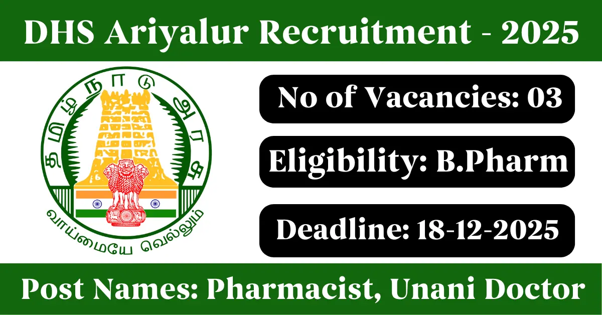 DHS Ariyalur Recruitment 2025: Apply for 3 Pharmacist, Unani Doctor vacancies. District Health Society Ariyalur invited applications from eligible and interested candidates to fill up Pharmacist, Unani Doctor Posts through DHS Ariyalur official notification December 2025. Job seekers who are looking for a career in Ariyalur – Tamil Nadu Government can make use of this opportunity. Interested candidates can Apply Offline on or before 18-Dec-2025